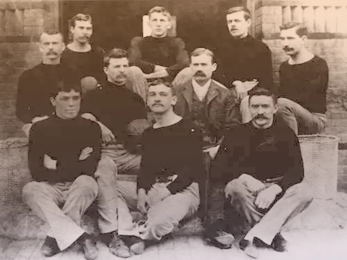 The team that made basketball history, as the first ever. Dr. James Naismith wears the suit. Photo courtesy National Archives.