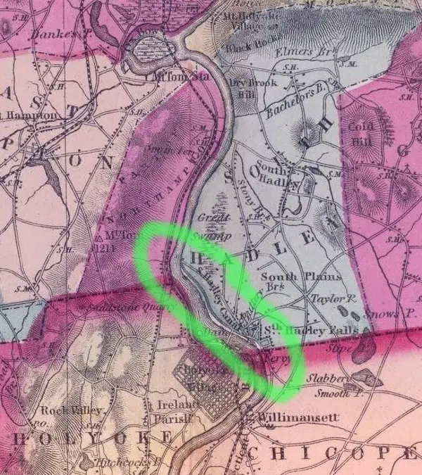 Map of South Hadley and environs, with the canal circled in green