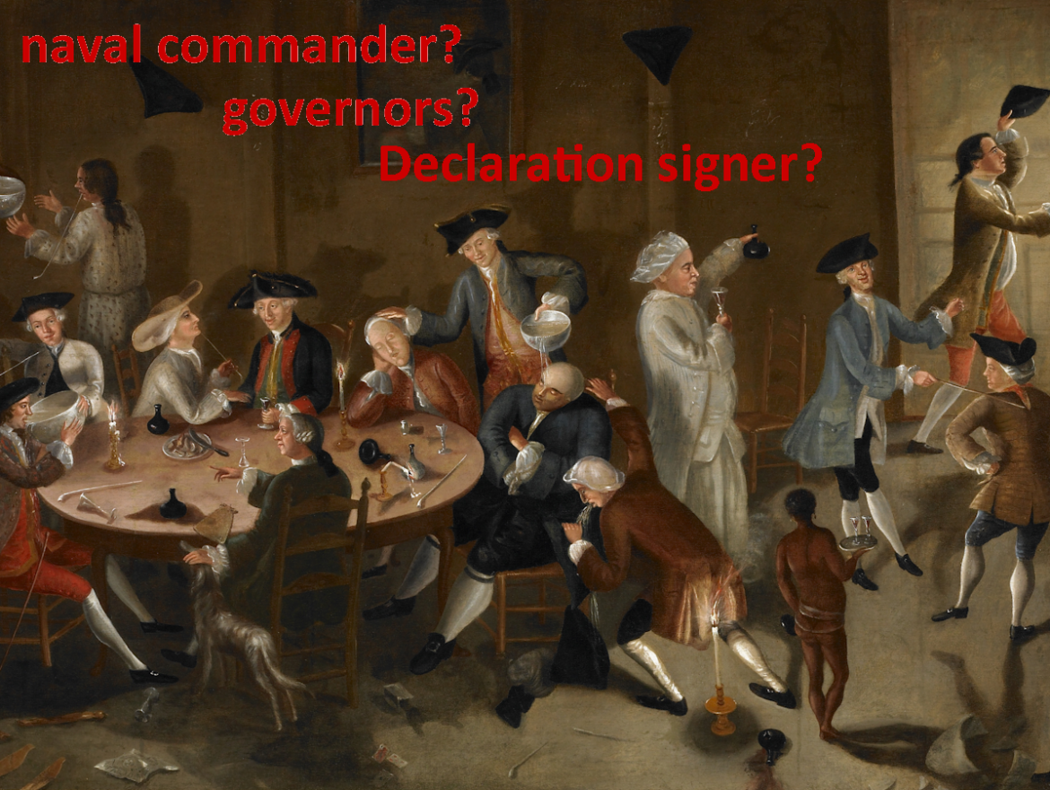 That noble sentiment is missing from Sea Captains Carousing in Surinam, if, as people believe, the man passed out next to Esek Hopkins is indeed Stephen Hopkins.