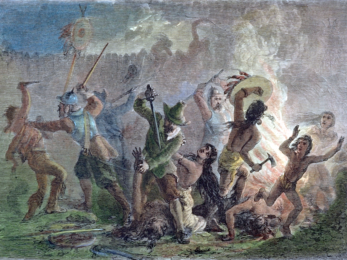 “Captaine Mason [Connecticut] entring into a Wigwam, brought out a fire-brand, after he had wounded many in the house, then he set fire on the West-side where he entered, my selfe set fire on the South end with a traine of Powder, the fires of both meeting in the center of the Fort blazed most terribly, and burnt all in the space of hafe an houre…many were bujrnt in the Fort, both men, women and children, others forced out…which our souldiers received and entertained with the point of the sword; downe fell men, women, and children…not above five of them escaped out of our hands.”